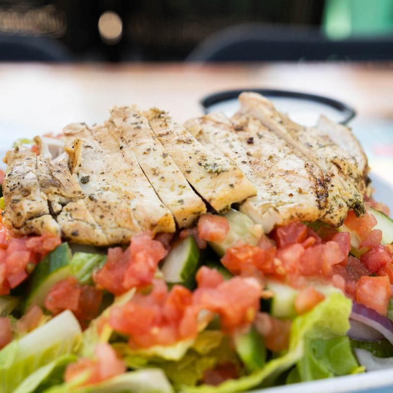 Grilled marinated chicken breast on top of crisp romaine lettuce, cucumbers, tomatoes, green peppers, and onion.