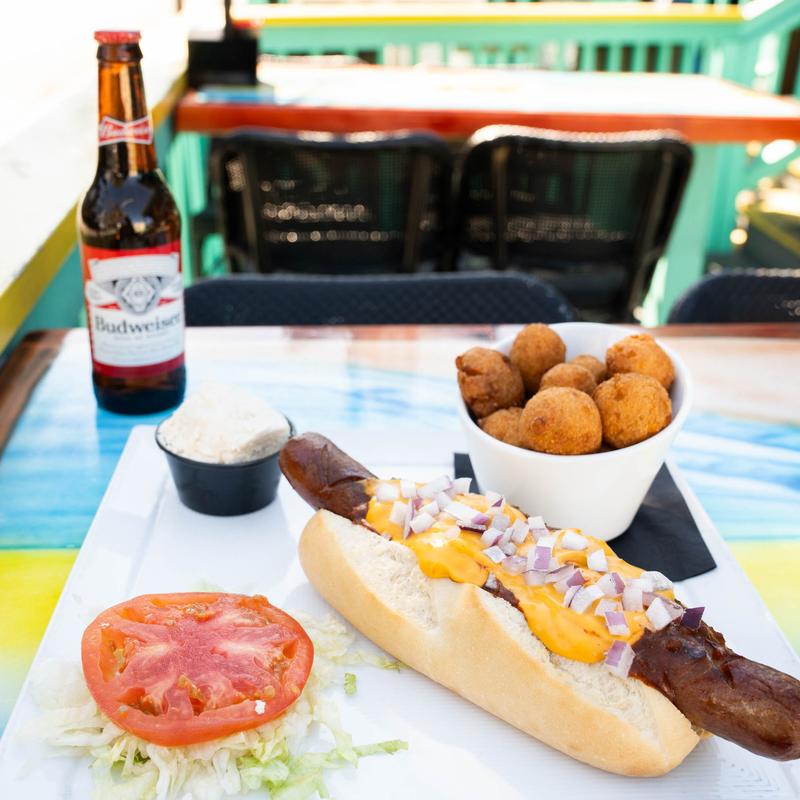 We hope you're hungry! Grilled 1/2 lb hot dog all the way-chili, cheese and onions.