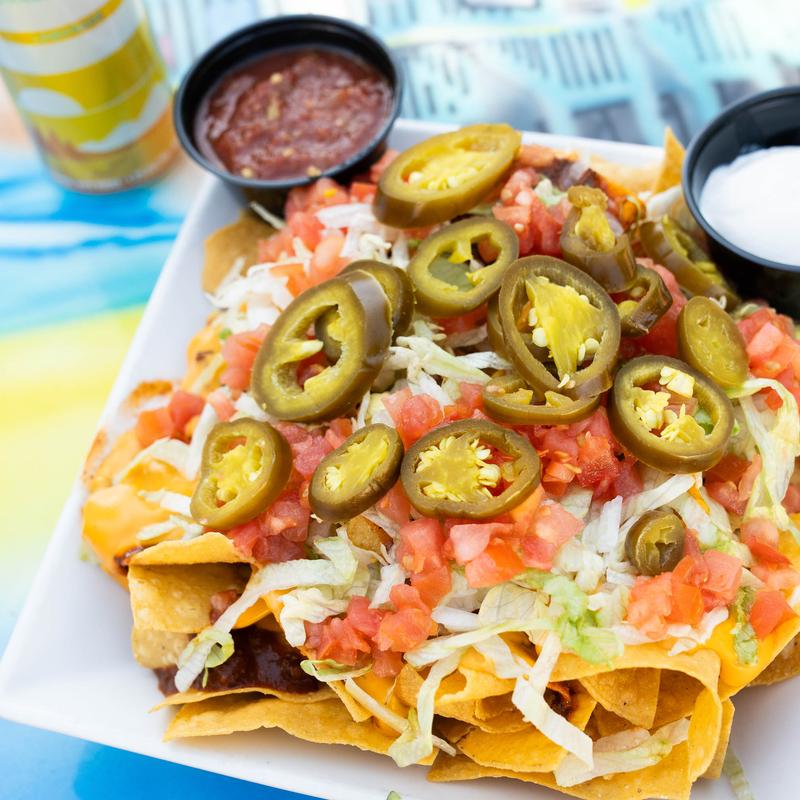 Crispy tortilla chips smothered with chili, nacho cheese, lettuce, jalapeños, and finely diced tomatoes.